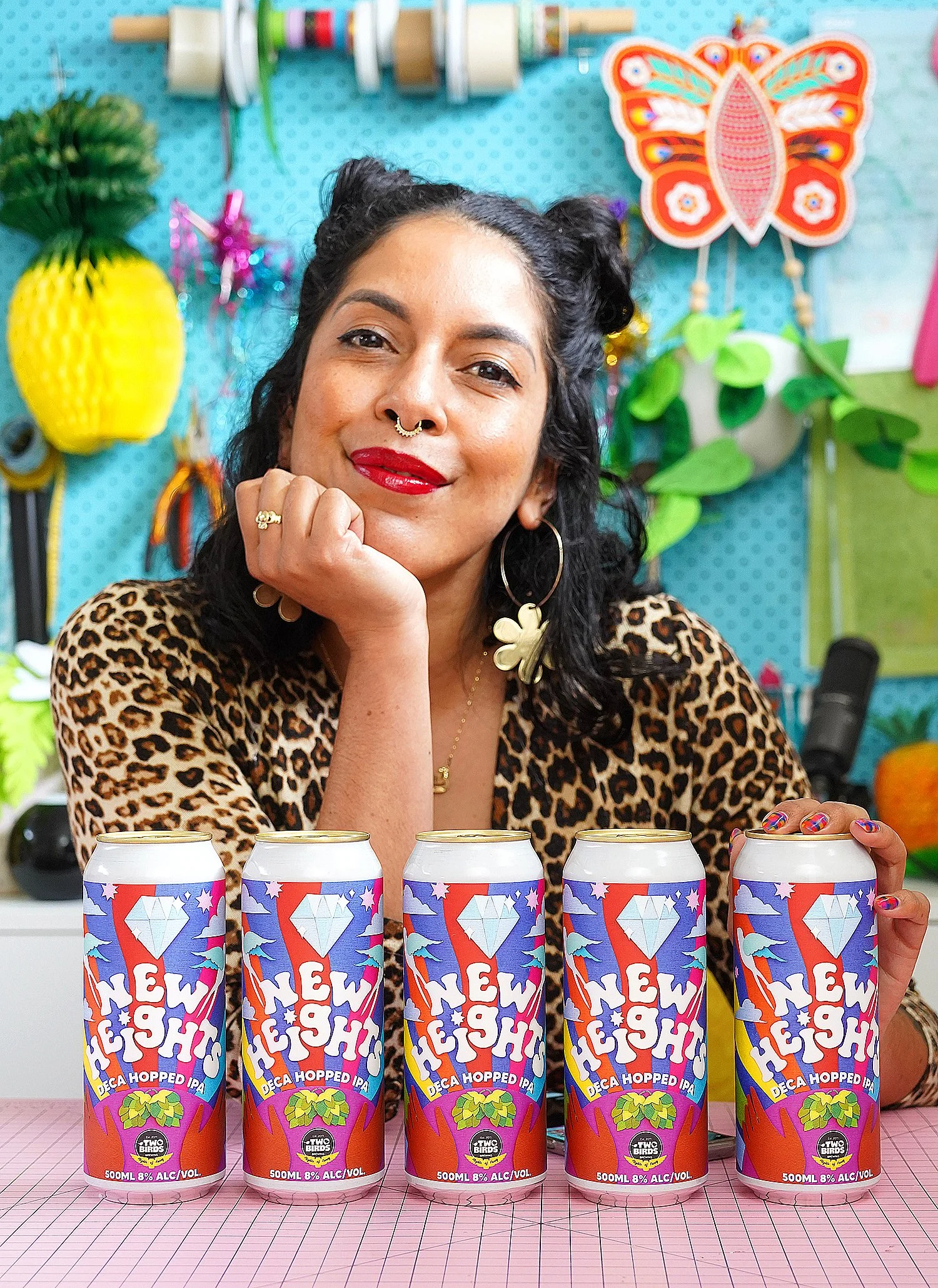 Papercraft collage beer label design and accompanying t-shirt design for ‘New Heights’, a limited edition beer from Melbourne-based brewery, Two Birds Brewing. The label illustration was handmade using paper motifs, photographed and digitised to create the design.